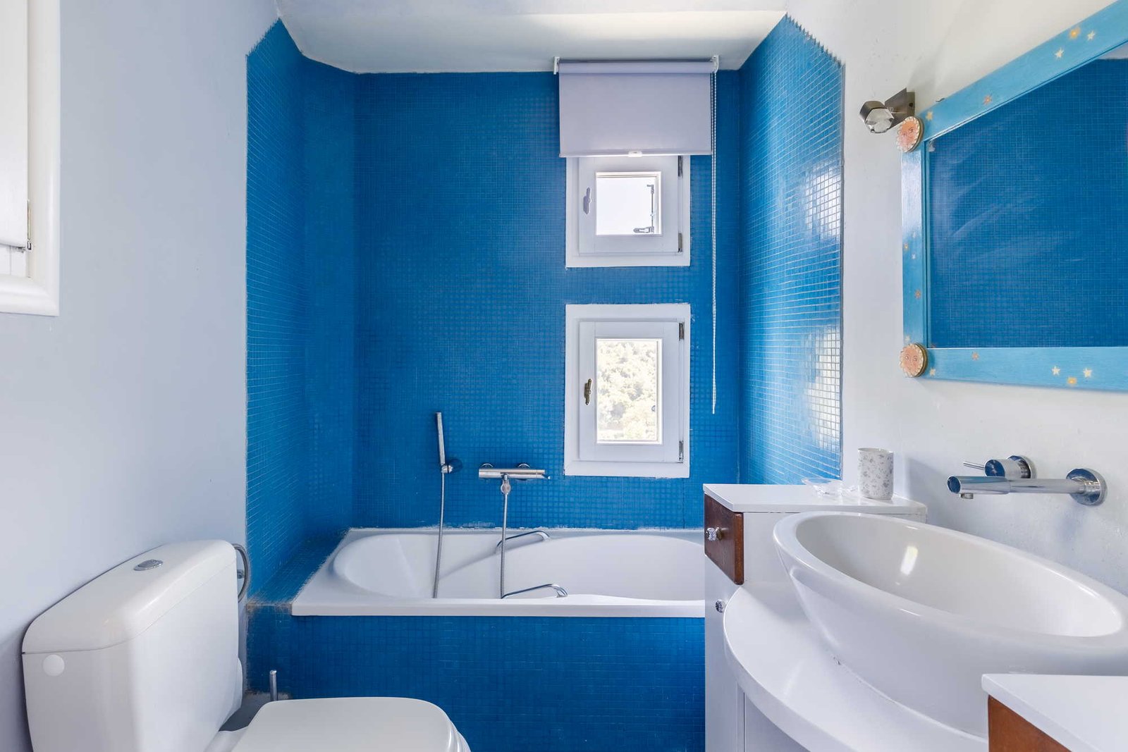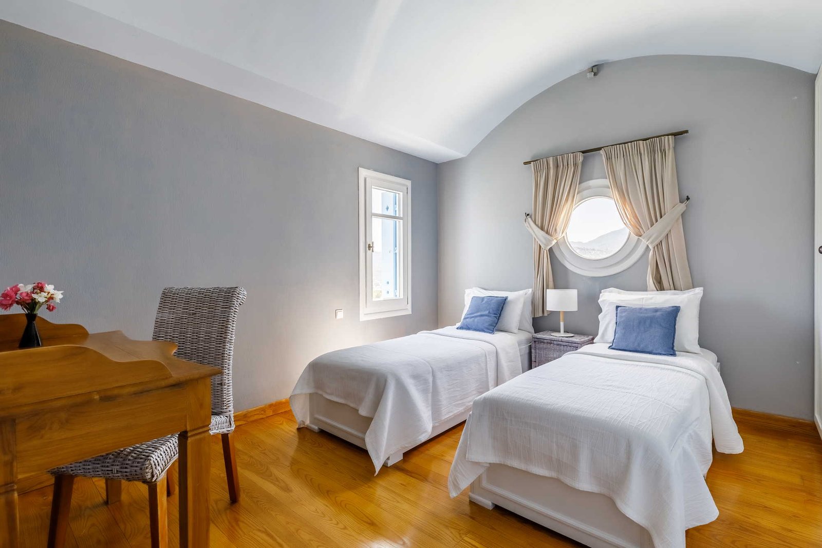 Inside, the ground floor features a light-filled open-plan living space, seamlessly connecting the sitting room, dining area, and kitchen. This inviting space opens out to a shaded veranda, with expansive windows offering views of the garden and pool. A family bathroom with a shower is also conveniently located on this level. Upstairs, you’ll find a double bedroom and a twin, both characterised by their lofty timber ceilings that enhance the airy, cool atmosphere. A second bathroom with a bathtub completes the upper floor. With its exceptional setting and thoughtful design, Villa Aetoma is unquestionably one of Skopelos’ most sought-after retreats.