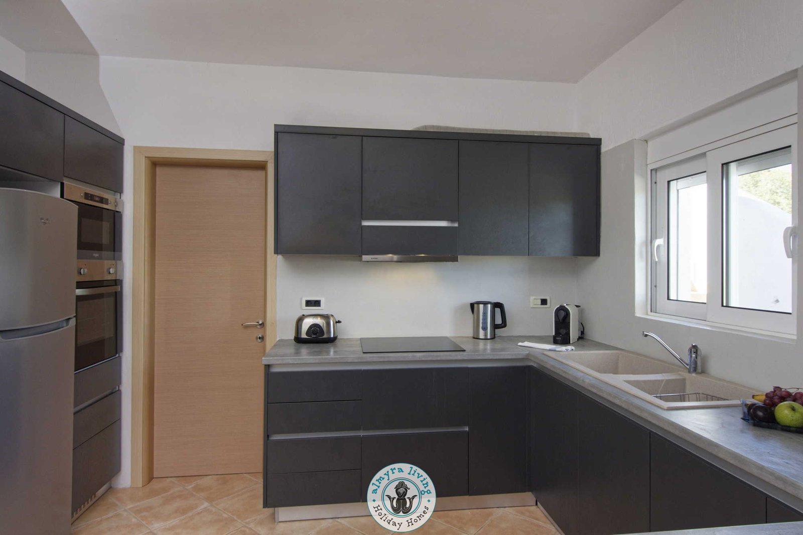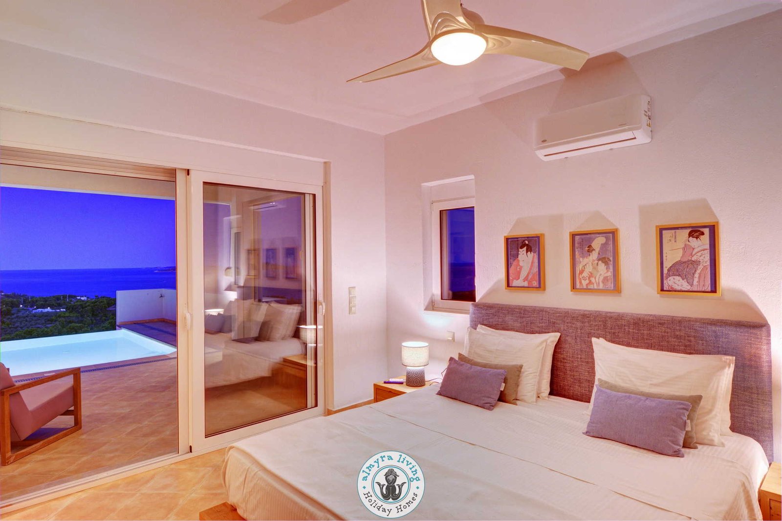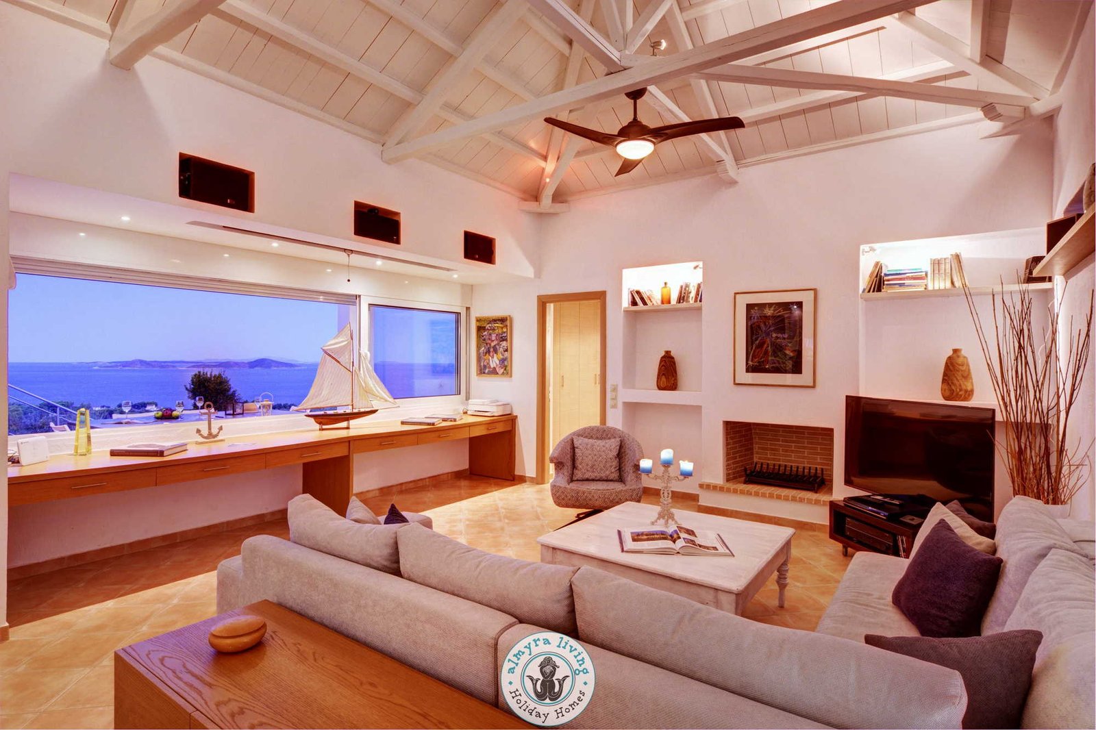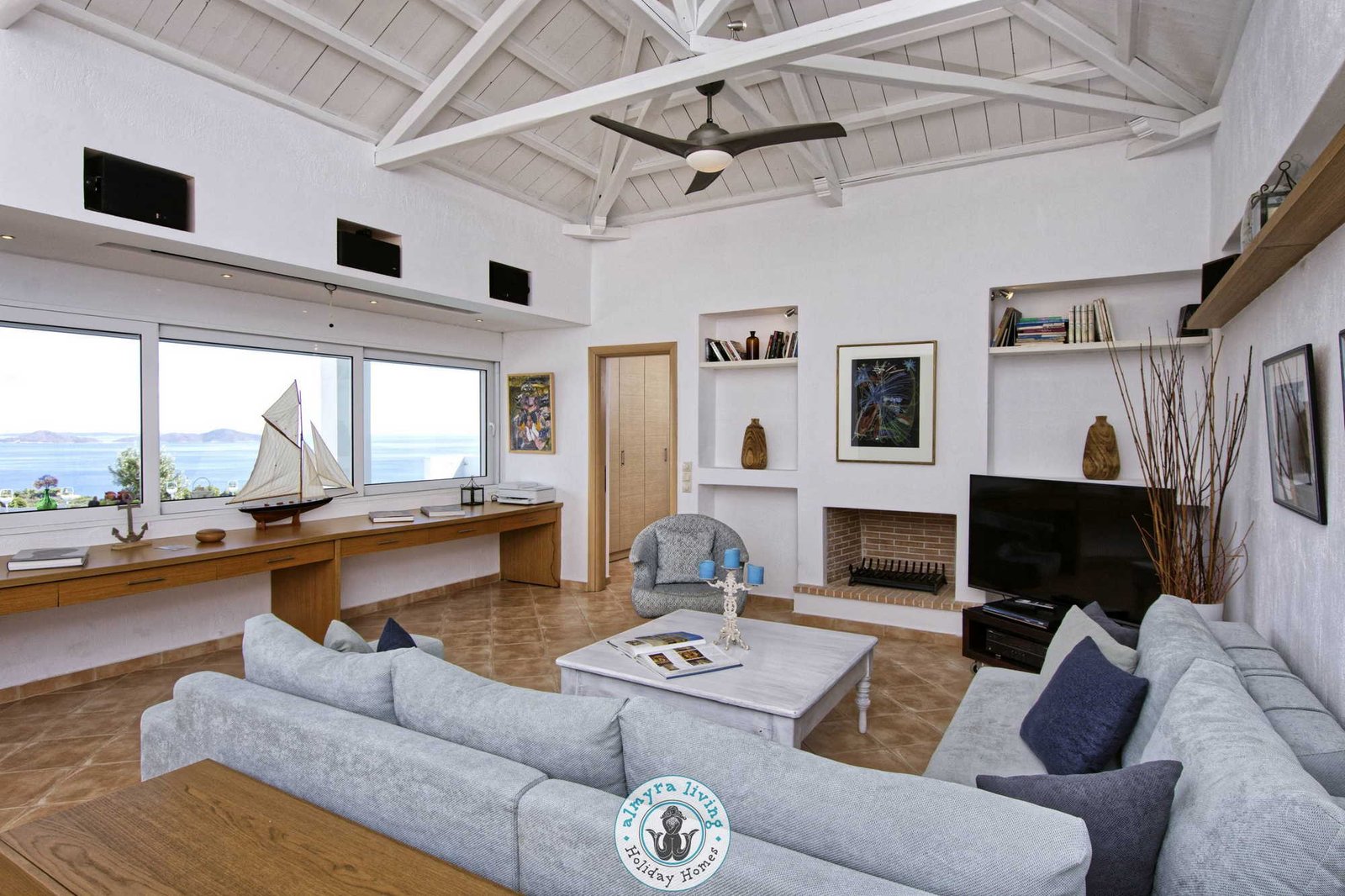 Inside, a bright, contemporary interior welcomes guests with a fully equipped kitchen and a spacious open-plan living area, complete with a cosy L-shaped sofa, TV, fireplace, and dining table. A stunning wall of windows draws in the natural light and frames the breathtaking sea vistas, while French doors open directly onto the pool terraces. The villa features three beautifully appointed bedrooms and three modern bathrooms, including a master suite where the sunrise over the sea is simply unforgettable.